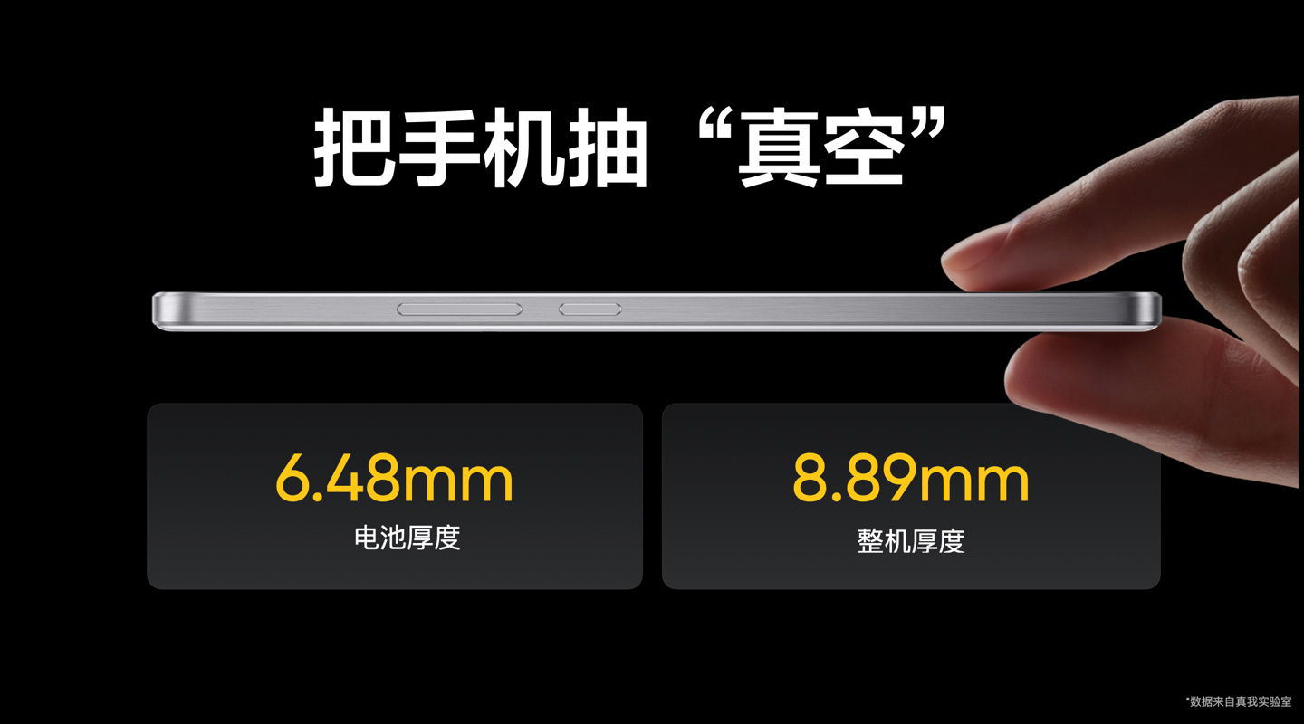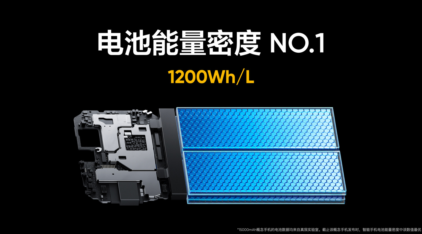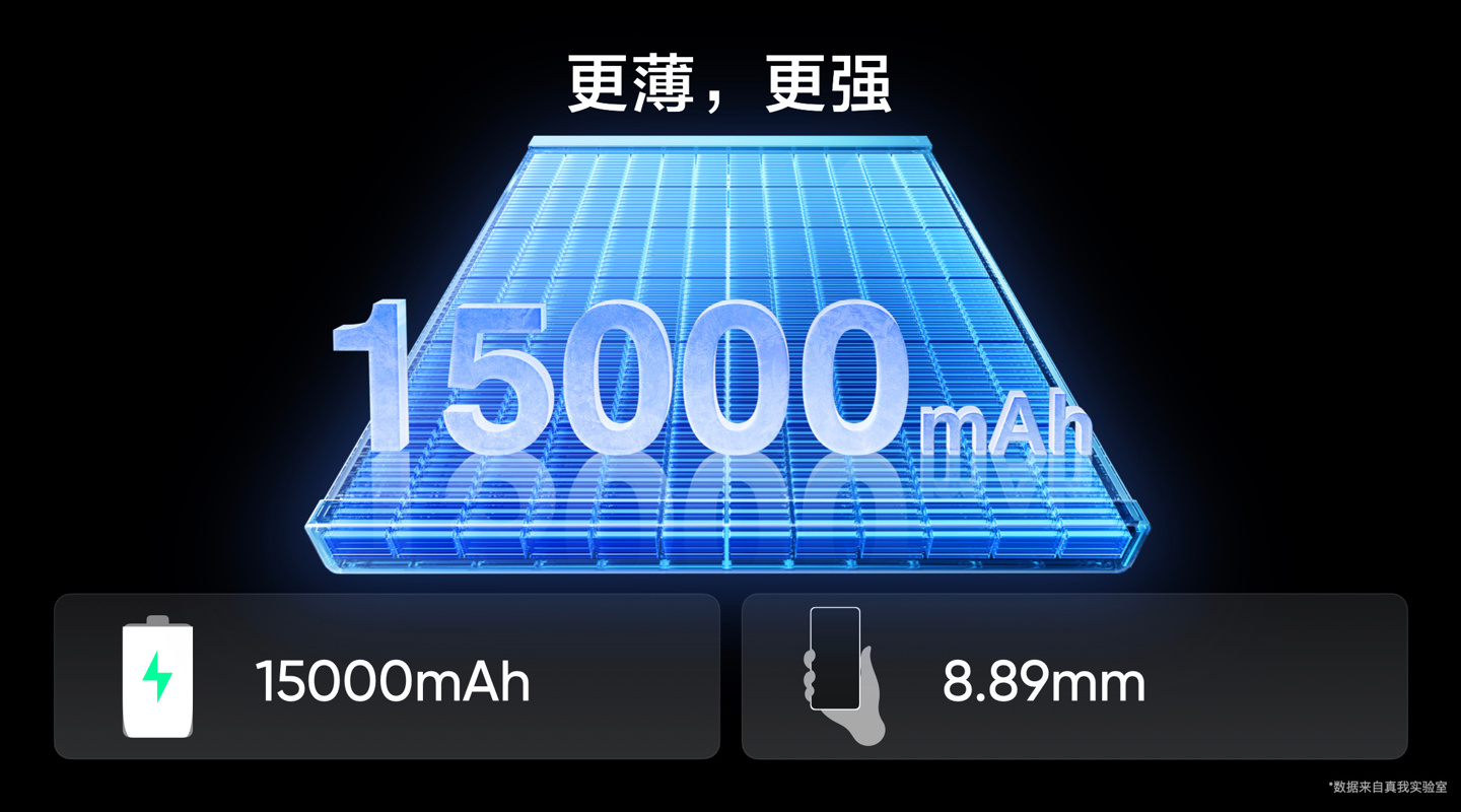 据介绍,真我 15000mAh 概念手机采用了全球首款 100% 硅负极电池,容量更大,电池更轻薄;电池能量密度达到 1200Wh / L,为传统硅碳负极电池的 1.3 倍以上;电池厚度 6.48mm,整机厚度小于 9mm。