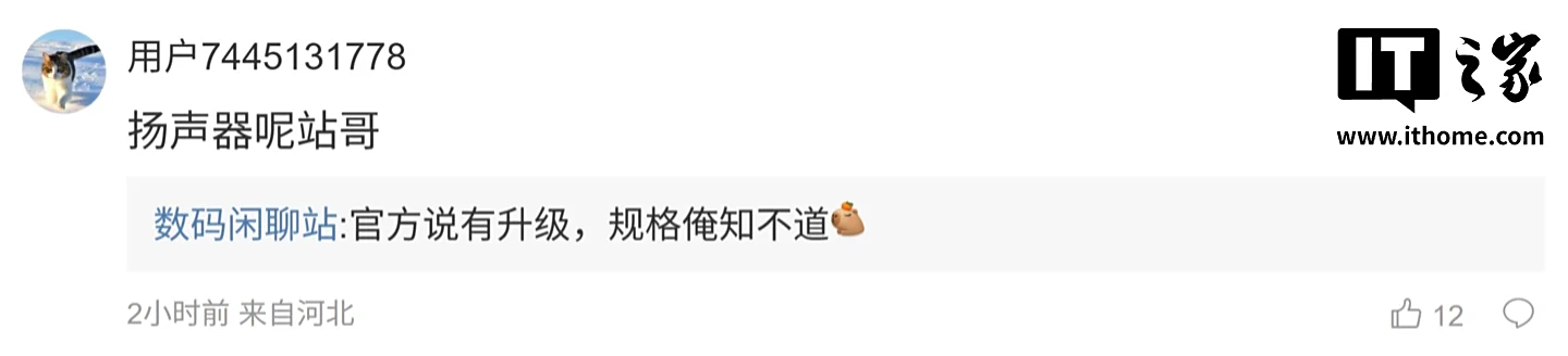 而另一位网友则询问道:“扬声器呢站哥”,博主则表示:“官方说有升级,规格俺知不道”。