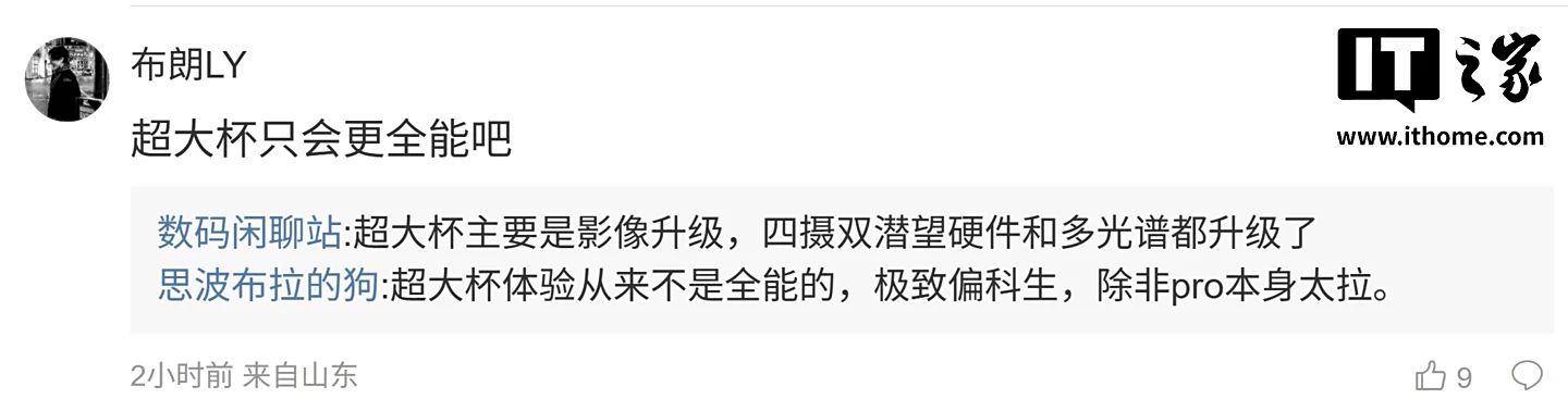 ”;另一位用户则表示:“超大杯只会更全能吧”,博主则回复道:“超大杯主要是影像升级,四摄双潜望硬件和多光谱都升级了”。