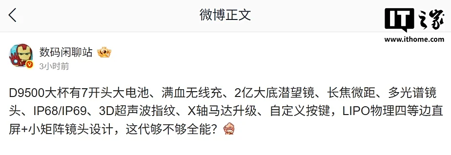 IT之家 8 月 28 日消息,博主 @数码闲聊站 今天在微博透露,某厂的天玑 9500 芯片大杯手机将拥有 7000mAh 以上电池、满血无线充等配置。