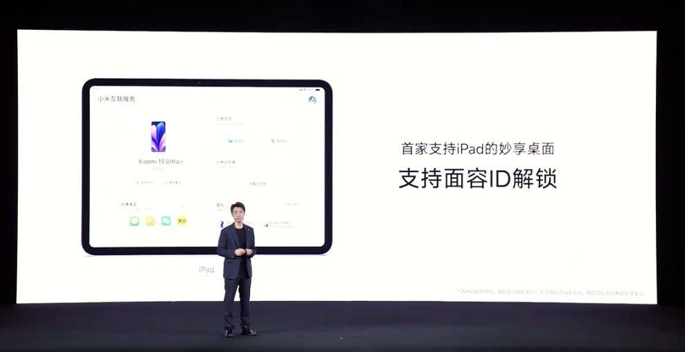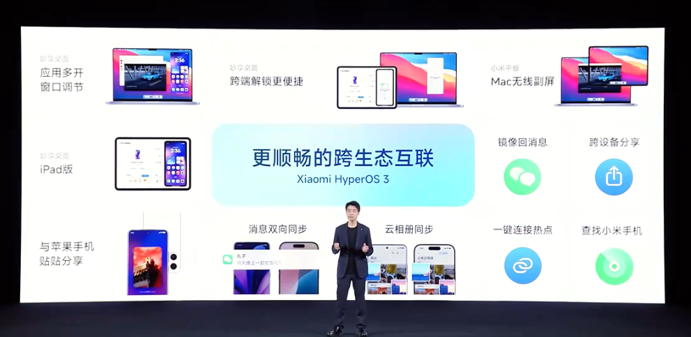 对于小米手机和 MacBook、iPad 的双持体验,澎湃 OS 3 支持了电脑端的拖拽传输、多窗口打开应用,还有 iPad 面容 ID 解锁手机。