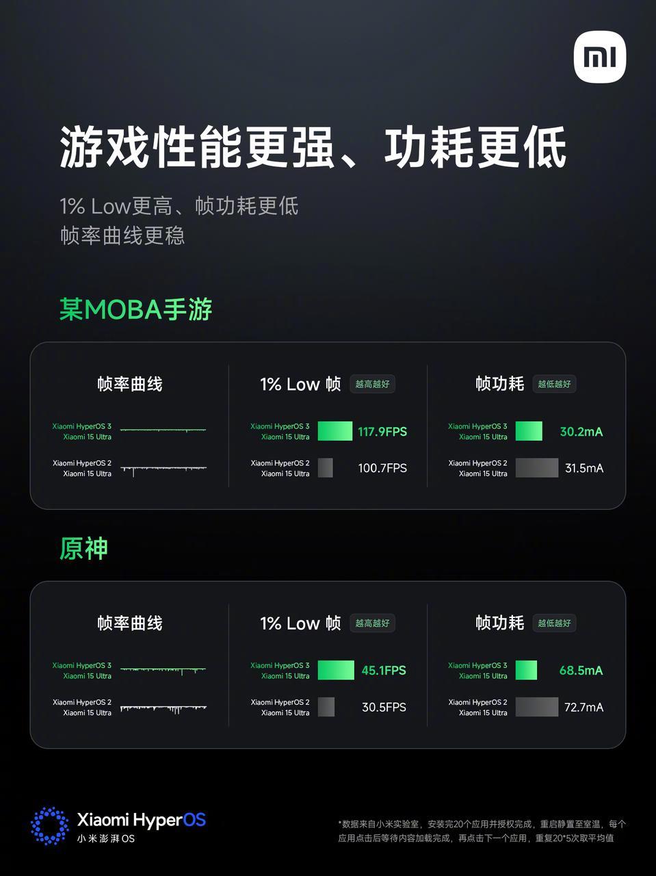 性能方面,澎湃 OS 3 叠加自研芯片积累,全场景能效提升,渲染负载更低、稳定性更高;底层技术之上,优化 100 + 系统动效,感官流畅全面升级。