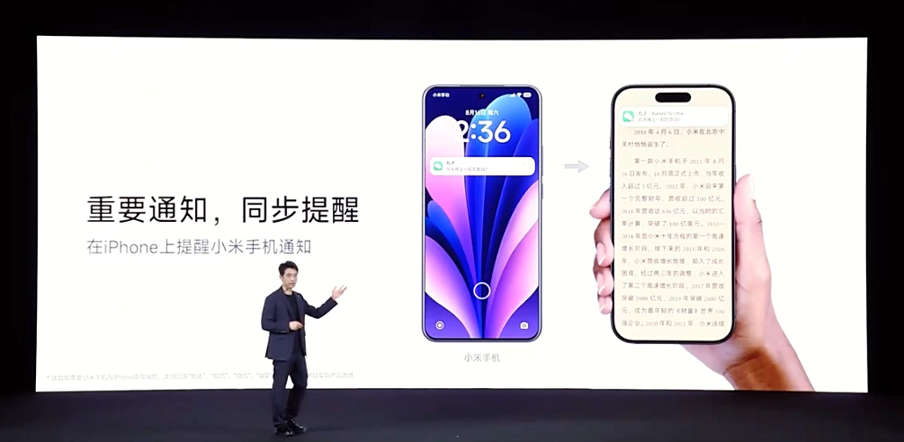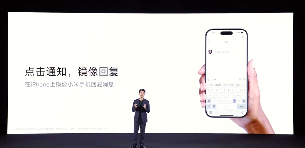 对于小米手机和苹果 iPhone 双持的用户,新系统支持了手机消息双向同步,且点击消息可以打开镜像模式直接回复消息。