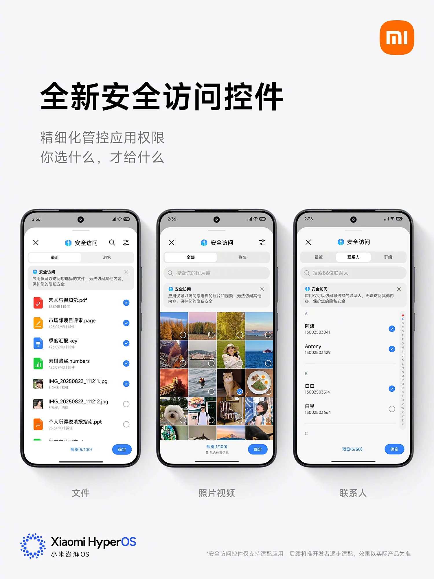 澎湃 OS 3 还支持全新安全访问控件,精细化管控应用权限,比如只给某个 App 某张图的权限,而不是相册的所有权限。