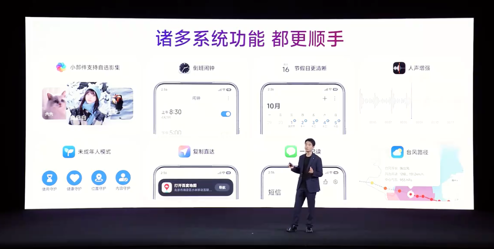 澎湃 OS 3 还对多项系统功能进行了优化,比如小部件支持自选影集、倒班闹钟、节假日更清晰、未成年人模式、复制消息直达地图、短信一键已读等。