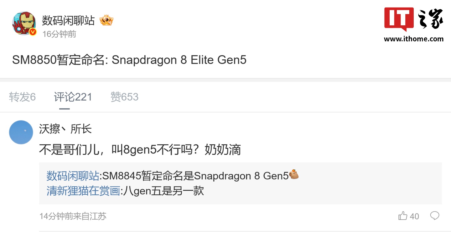 IT之家 8 月 29 日消息,消息博主 @数码闲聊站 稍早前表示高通即将在下月发布的新一代旗舰移动平台芯片 SM8850 暂定命名为骁龙 8 Elite Gen 5。