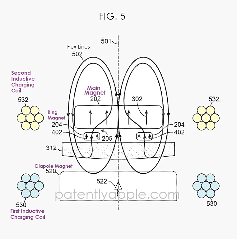 该专利的核心是“双磁体架构”。不同于 MagSafe 的单一环形磁体,新方案组合采用中央主磁体与较薄的环形磁体。主磁体提供强大的中心磁场,环形磁体则增强并稳定磁场分布,让接收线圈与发射线圈能够更精准地同轴对齐,从而减少位置偏差并提升能量传输效率。