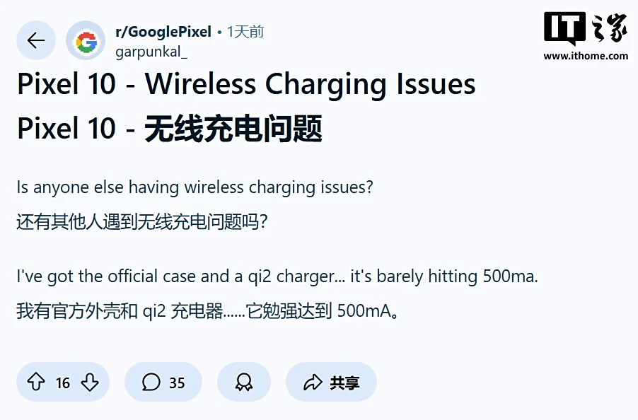 文章来源于互联网:IT之家-部分谷歌 Pixel 10 系列手机被曝无线充电问题:充电中断 / 功率降至约 5W