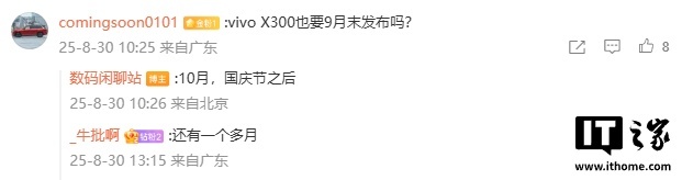 值得一提的是,他还在评论区透露,vivo X300 系列手机将在 10 月国庆节之后发布。