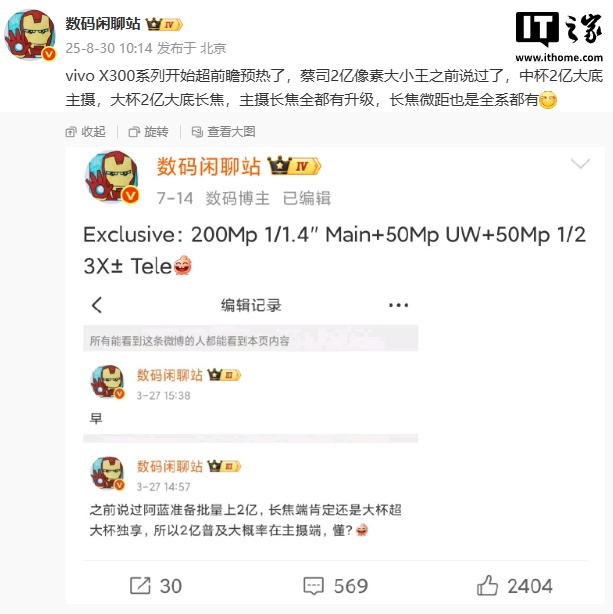 IT之家 8 月 30 日消息,博主 @数码闲聊站 今日曝光 vivo X300 系列手机部分信息,搭载蔡司 2 亿像素镜头,标准版搭载 2 亿大底主摄,Pro 版搭载 2 亿大底长焦,主摄长焦全都有升级,长焦微距也是全系都有。