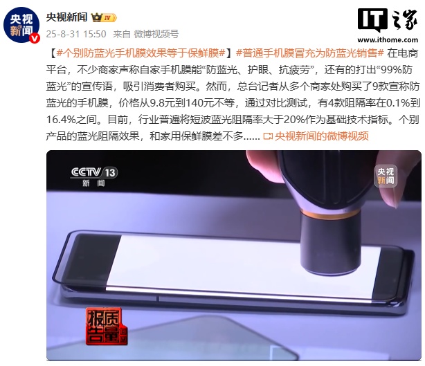文章来源于互联网:IT之家-央视曝光个别防蓝光手机膜效果相当于保鲜膜,实际与宣传差距较大