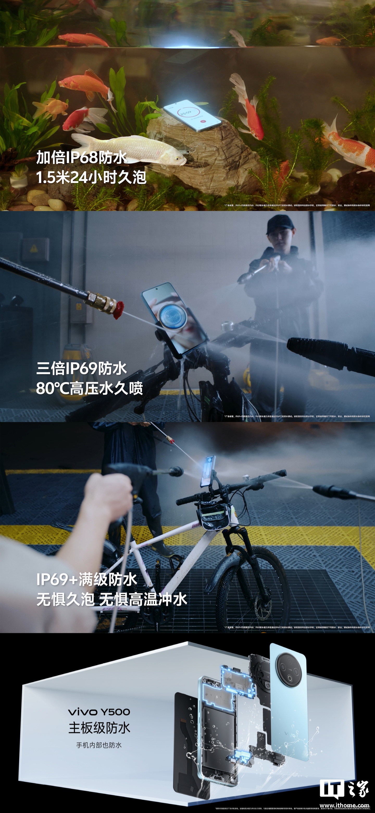 vivo Y500 拥有 vivo 史上最强 P69 + 满级防水,通过了 1.5 米水深、24 小时浸泡测试,也具备三倍 IP69 防水能力。主板级防水,手机内部也防水。新机采用全新金刚磐石架构,通过 SGS 金标五星抗跌耐摔认证以及五项严苛环境测试,手机微跌落测试能力较上代提升 47%,抗压、抗弯测试能力提升 100%,高处跌落测试能力提升 70%。主板级缓震架构,手机内部也抗摔。