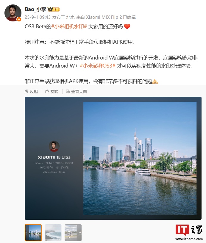 IT之家 9 月 2 日消息,小米澎湃 HyperOS 3 系统于 8 月 28 日发布并在次日开启 Beta 版推送。小米相机部的产品经理 @Bao_小李 昨日发文询问 Beta 版本的小米相机水印是否好用,并提醒不要通过非正常手段获取相机 APK 使用。