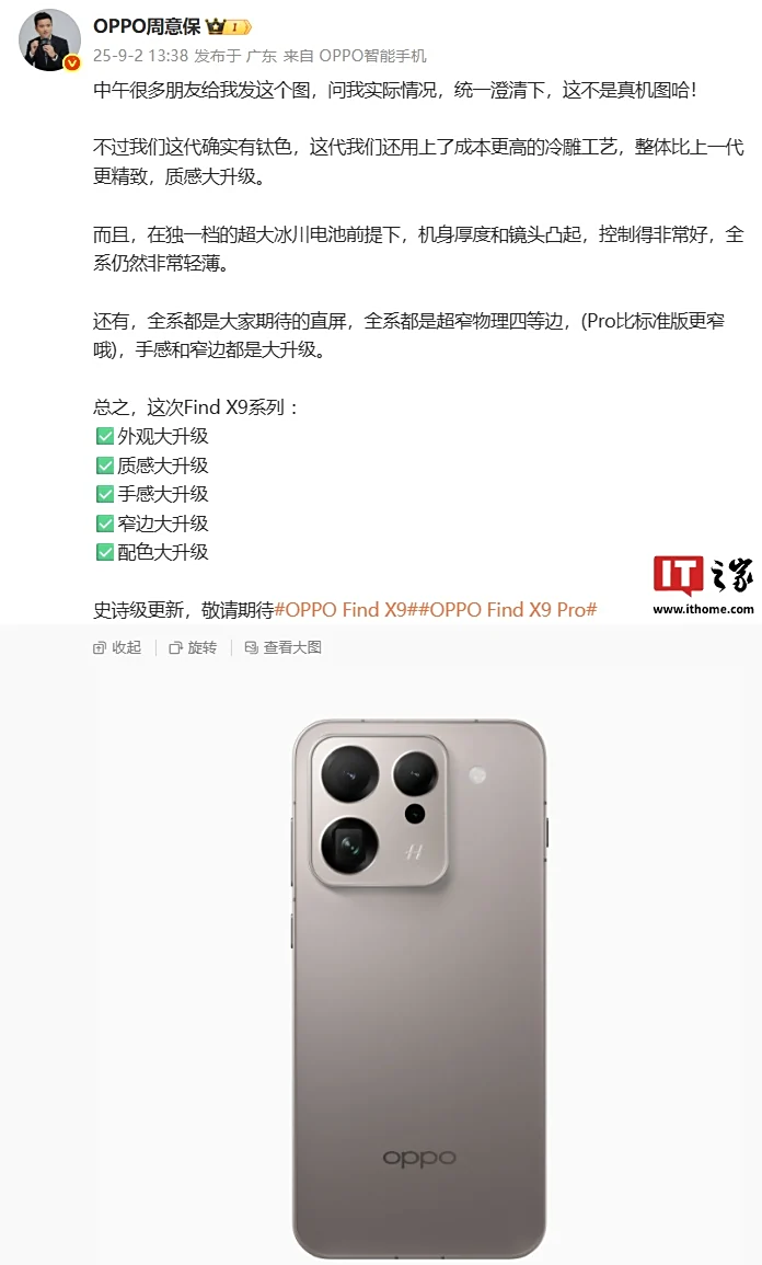 IT之家 9 月 2 日消息,OPPO Find 系列产品负责人周意保今日发文否认了此前的 Find X9 外观曝光图,直言这不是真机图。不过周意保确认,新机将提供钛色,同时还用上了成本更高的冷雕工艺,整体比上一代更精致,质感大升级。