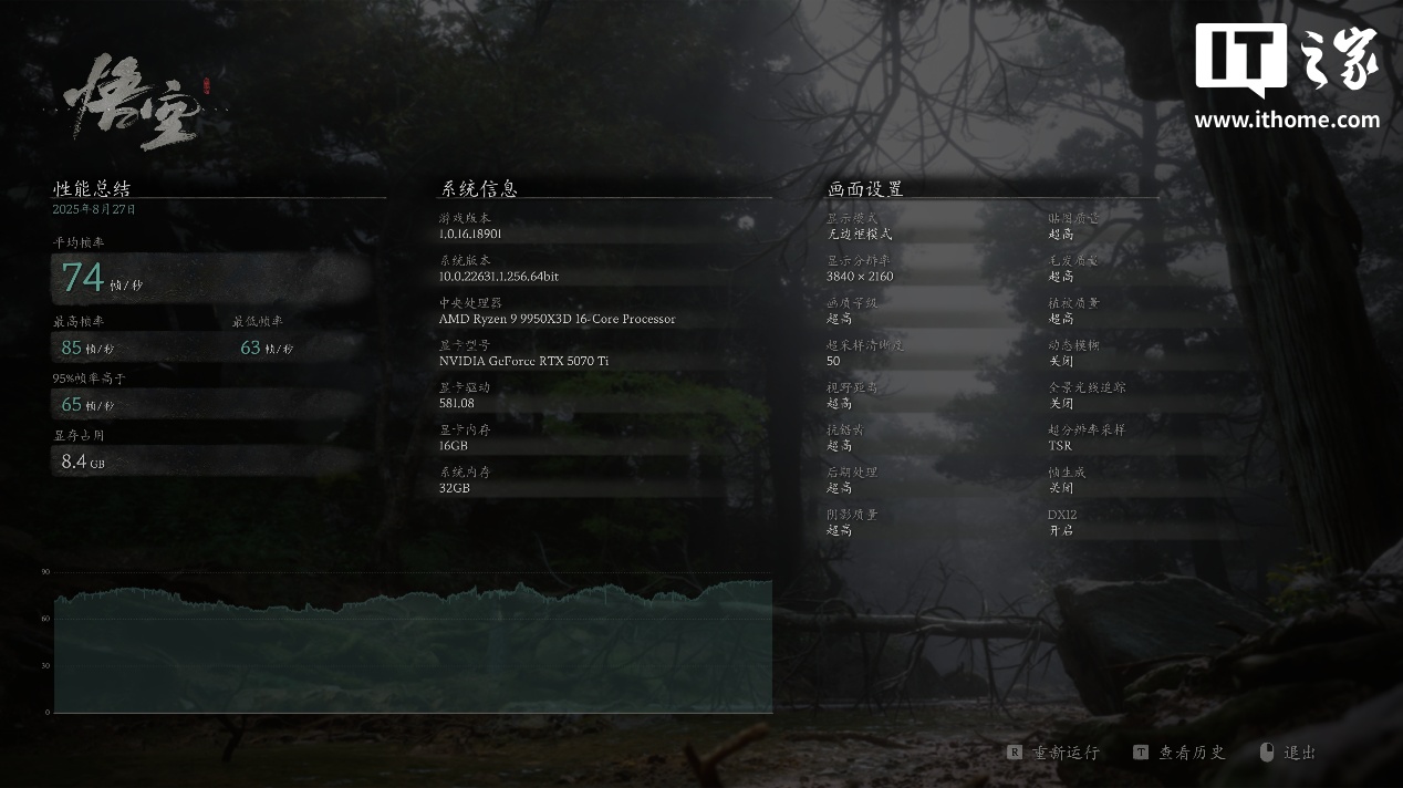 先看光追游戏的表现,《黑神话:悟空》采用虚幻 5 引擎制作,游戏性能被玩家调侃为“众生平等”,在 4K 分辨率、超高画质下开启超高全景光线追踪的情况下: