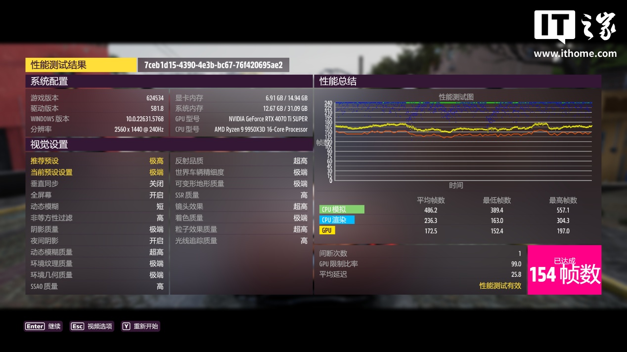 GeForce RTX 4070 Ti SUPER 的游戏平均帧数为 154 帧,1% Low 帧为 130 帧;