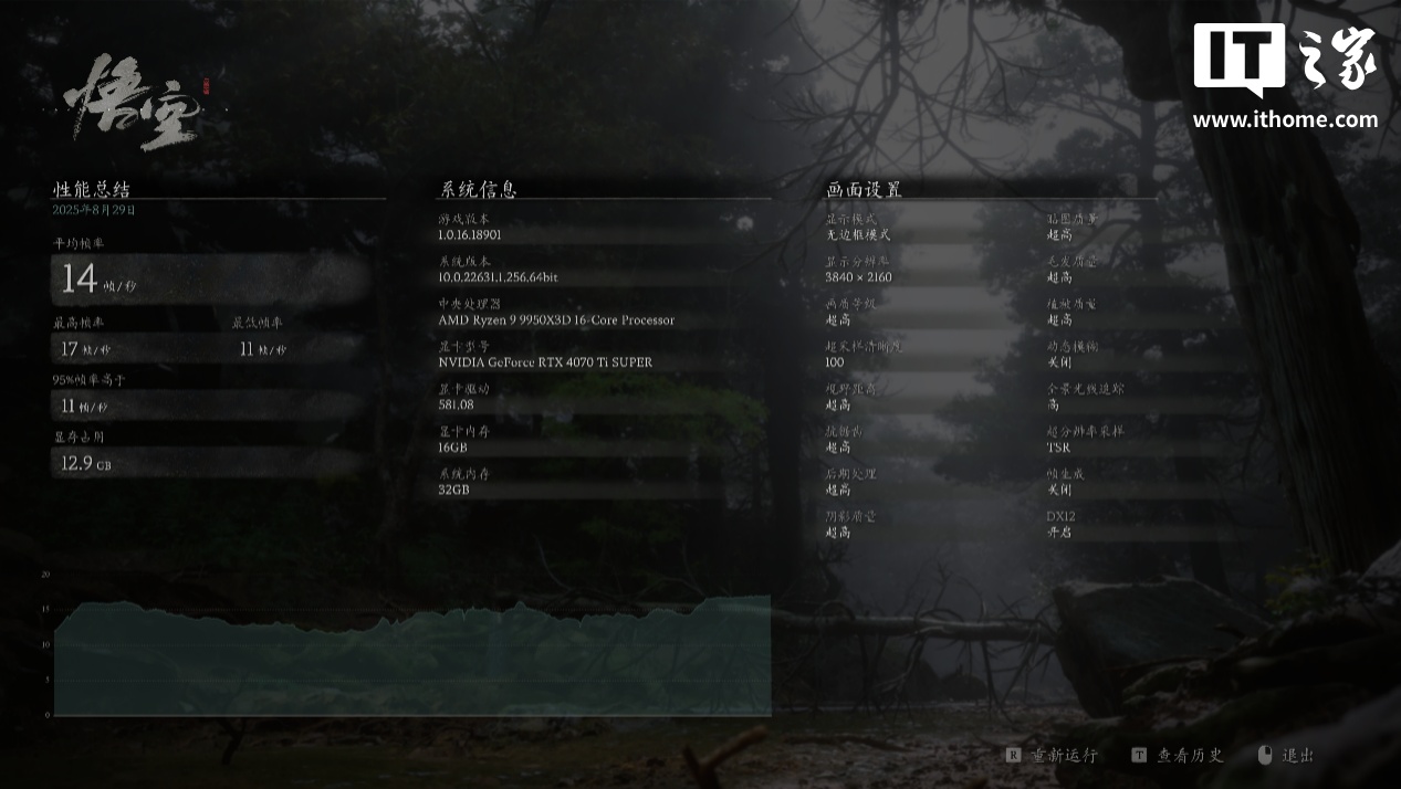 GeForce RTX 4070 Ti SUPER 的游戏平均帧数为 14 帧,1% Low 帧为 11 帧;