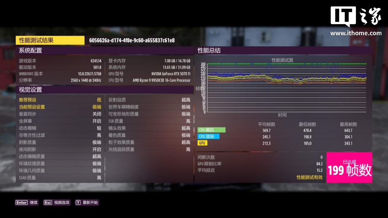 影驰名人堂 GeForce RTX 5070 Ti HOF 显卡的游戏平均帧数为 199 帧,1% Low 帧为 155 帧;