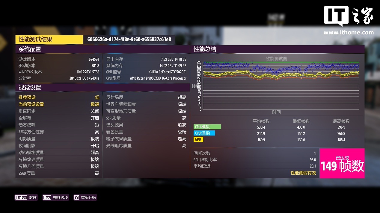 影驰名人堂 GeForce RTX 5070 Ti HOF 显卡的游戏平均帧数为 149 帧,1% Low 帧为 115 帧;