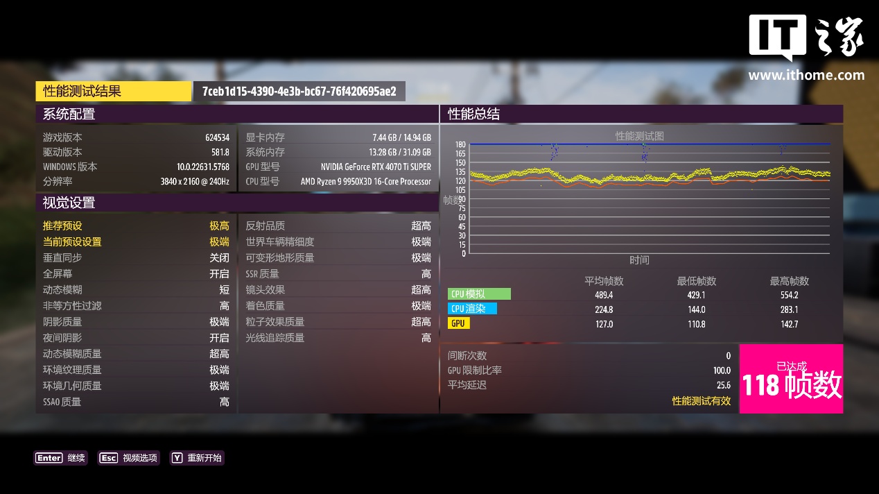 GeForce RTX 4070 Ti SUPER 的游戏平均帧数为 118 帧,1% Low 帧为 103 帧;