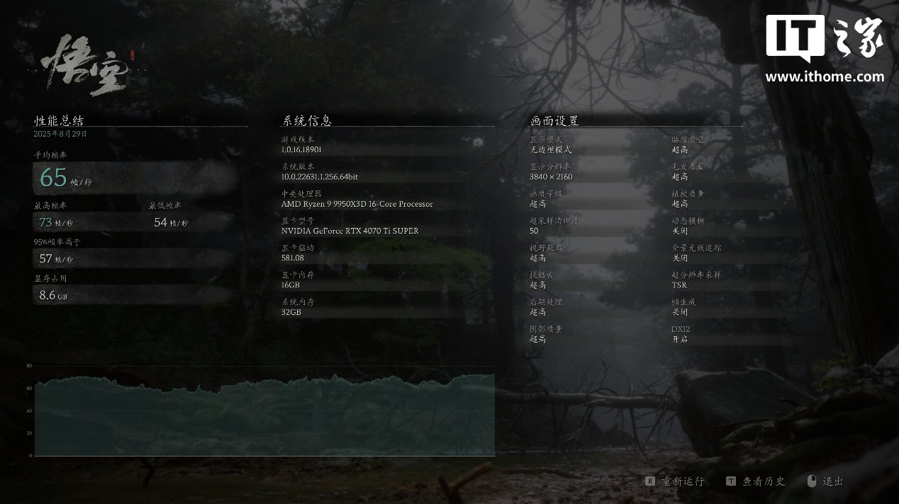 GeForce RTX 4070 Ti SUPER 的游戏平均帧数为 65 帧,1% Low 帧为 49 帧;