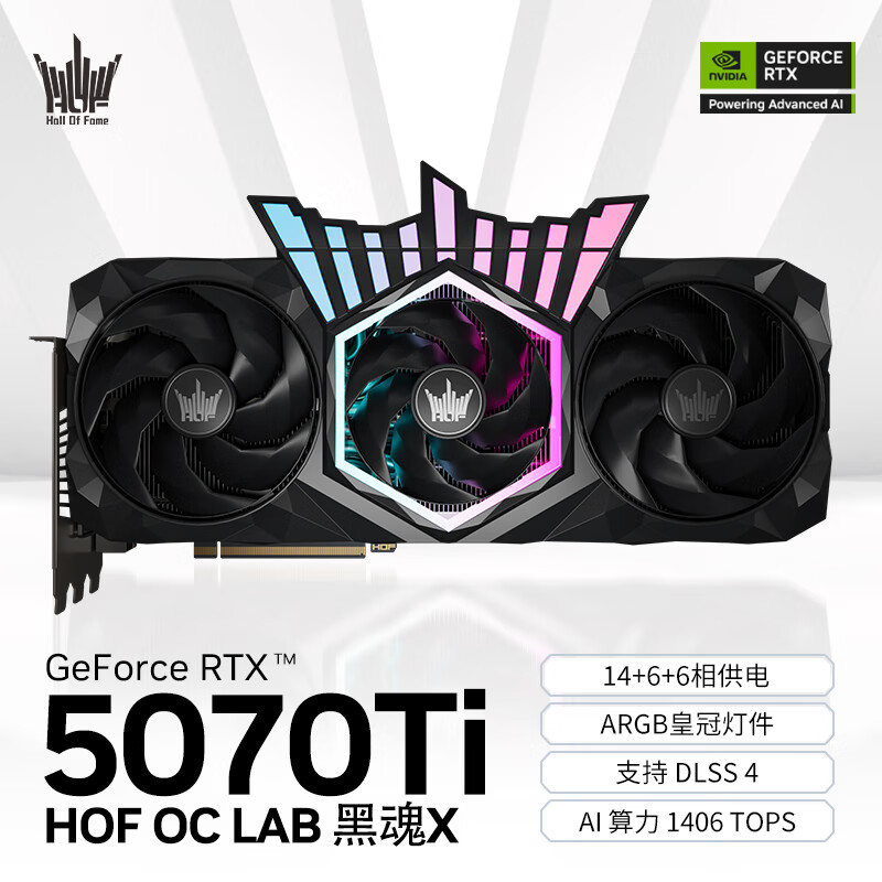 影驰名人堂 RTX 5070 Ti HOF OC LAB 黑魂 X 显卡基于 NVIDIA 全新 Blackwell 架构和 TSMC 4N 制程工艺打造,拥有 8960 个 CUDA 核心、1406 个 Tensor 核心、133 个光追核心;显存为 16GB 256-bit GDDR7 规格,显卡 TDP 为 300W。RTX 50 系显卡还拥有 DLSS 4 多帧生成技术与 Reflex 2.0 低延迟技术加持。