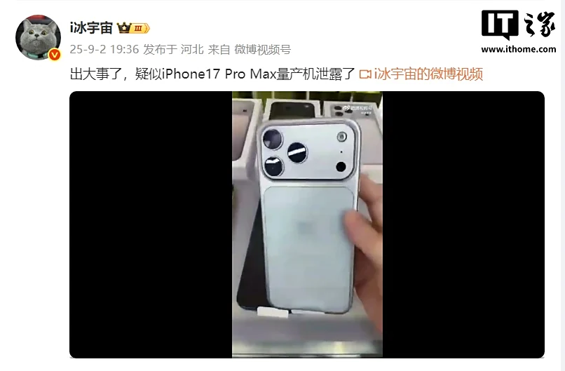 IT之家 9 月 2 日消息,苹果 iPhone 17 / Pro 系列手机预计将在 9 月 10 日凌晨的发布会上推出,博主 @i冰宇宙 今日晒出视频,称“疑似 iPhone 17 Pro Max 量产机泄露”。