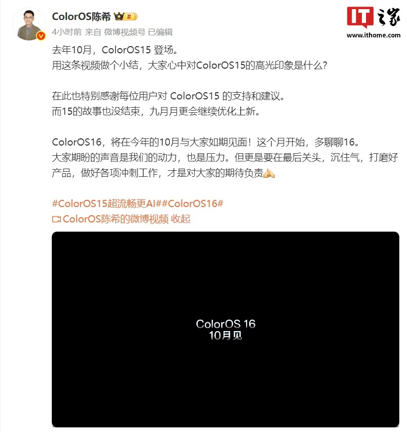 值得一提的是,OPPO ColorOS 设计总监陈希昨日宣布,ColorOS 16 将在今年的 10 月与大家如期见面。陈希还表示,15 的故事也没结束,九月月更会继续优化上新。这意味着 OPPO Find X9 系列新机有望和 ColorOS 16 系统同期发布。
