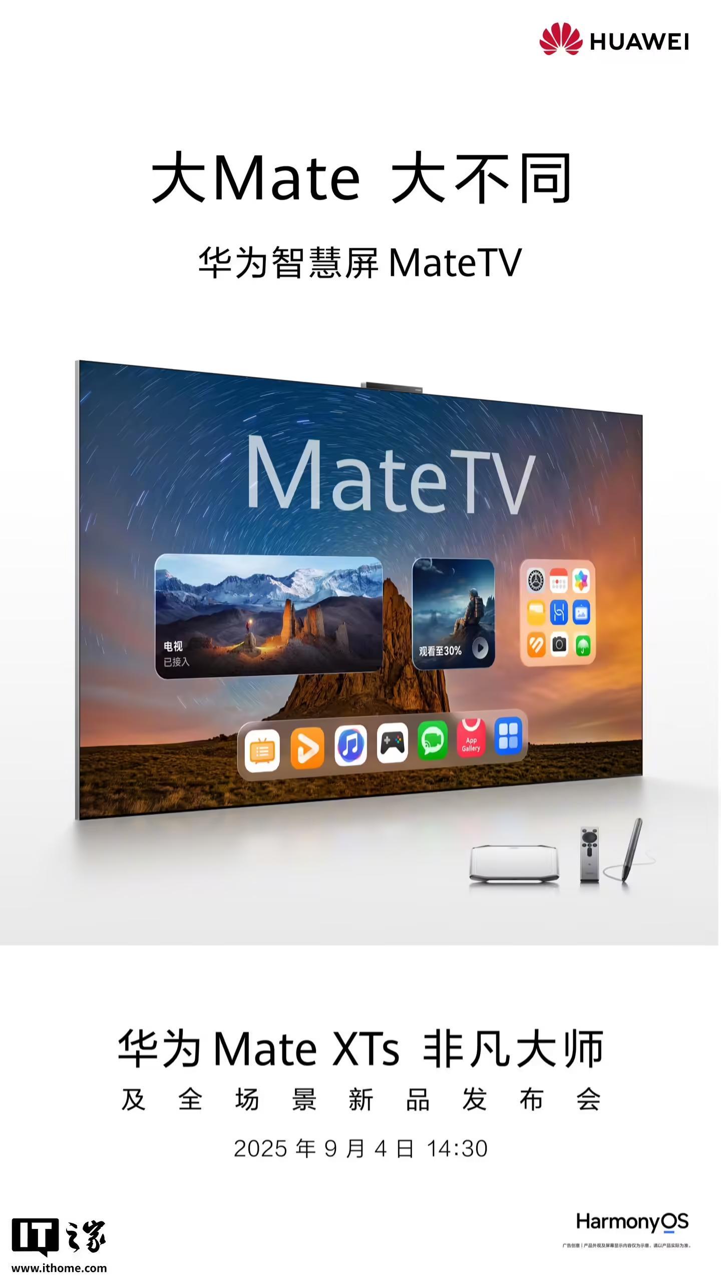 IT之家 9 月 4 日消息,华为史上最大的 Mate —— 华为智慧屏 MateTV 已官宣将于 9 月 4 日正式发布。