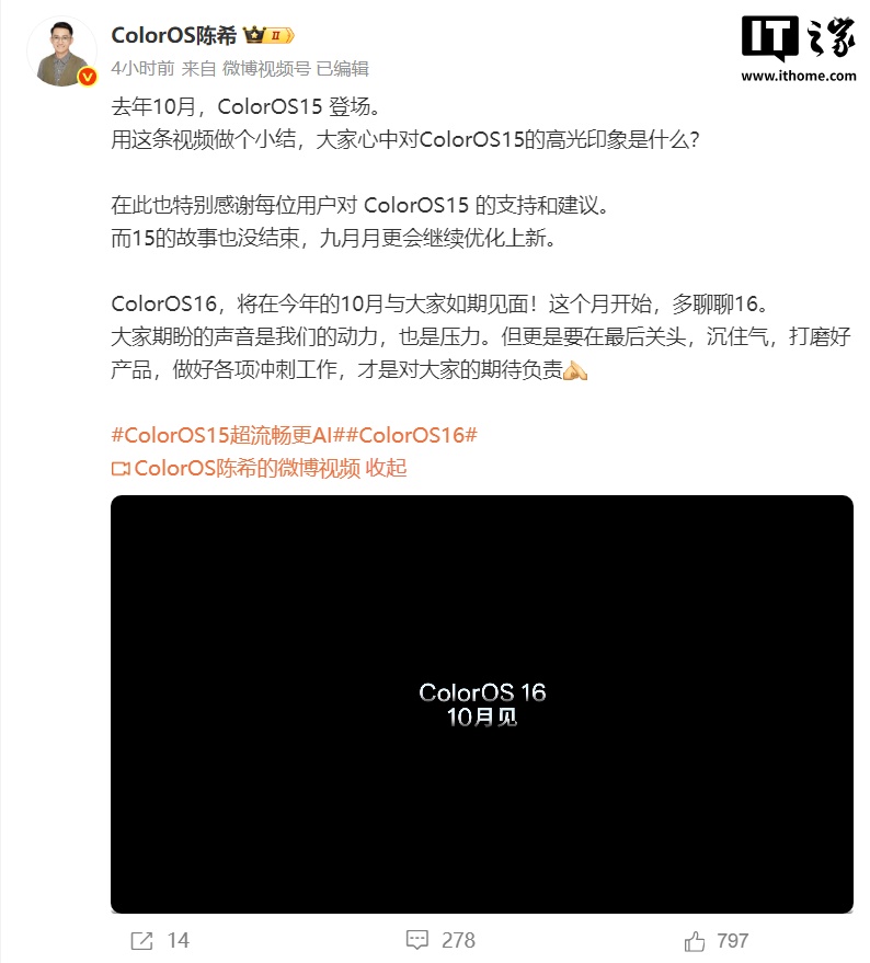 IT之家注意到,OPPO ColorOS 设计总监陈希 9 月 2 日宣布,ColorOS 16 将在今年的 10 月与大家如期见面。陈希还表示,15 的故事也没结束,九月月更会继续优化上新。