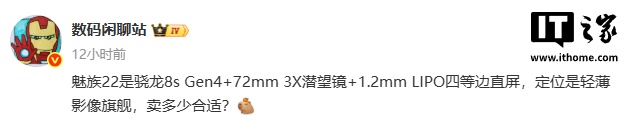 IT之家 9 月 4 日消息,博主 @数码闲聊站 昨日爆料称,魅族 22 手机搭载骁龙 8s Gen4+72mm 3X 潜望镜 + 1.2mm LIPO 四等边直屏,定位是轻薄影像旗舰。