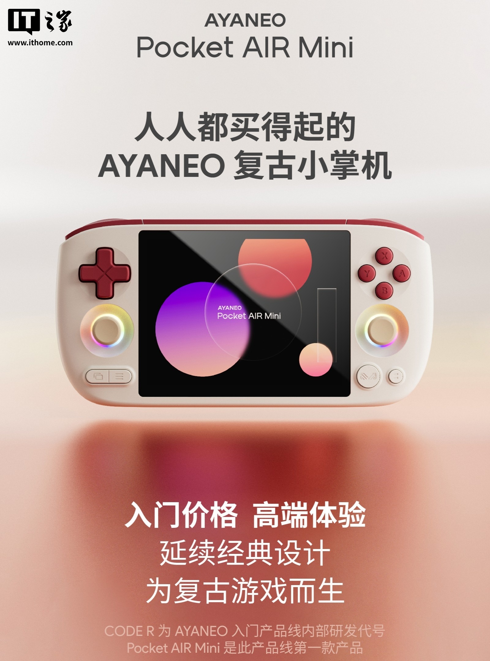 IT之家 9 月 4 日消息,AYANEO 今天预热了 Pocket AIR Mini 掌机,号称是“人人都能拥有的复古小掌机”。