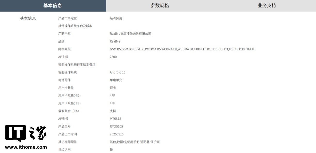 相关页面显示,realme 真我 15 手机采用矩阵相机模组设计,屏幕尺寸为 6.77 英寸(电容式触摸屏),前置 5000 万像素镜头、后置 5000 万像素 + 800 万像素镜头,预装 Android 15 系统。