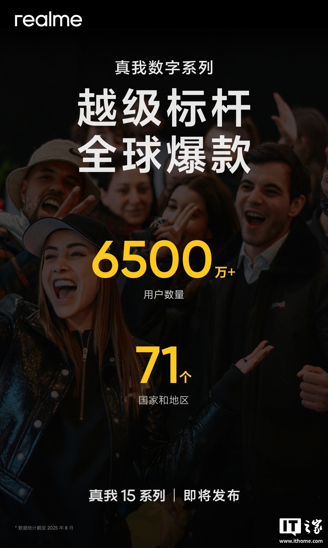 IT之家 9 月 4 日消息,realme 真我手机官方今日宣布真我 15 系列即将发布(具体时间未公布),新机号称“越级标杆,全球爆款”。真我手机官方还表示,真我数字系列全球累计用户超 6500 万,畅销 71 个国家和地区。