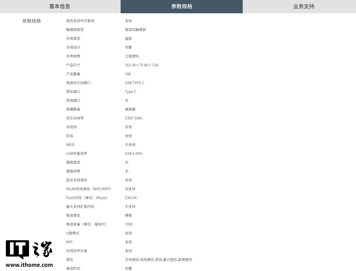 该机搭载 MT6878 处理器(天玑 7300)。尺寸为 163.34×75.88×7.66mm、重约 188g,配备 USB Type-C 接口,其屏幕分辨率为 2392*1080,内置 7000mAh 电池。