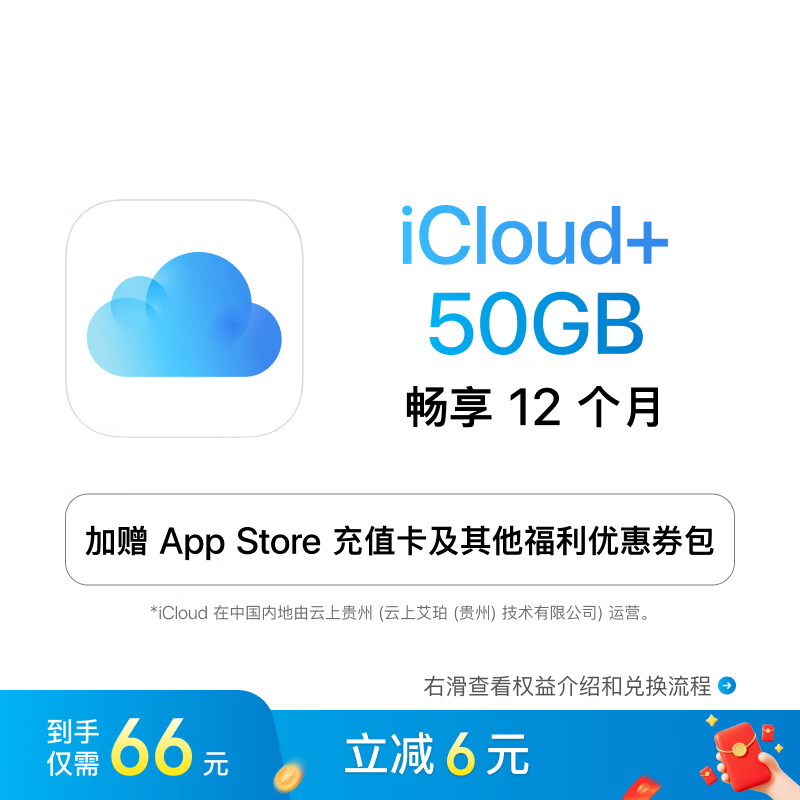 京东 iCloud+ 50GB 12 个月 5.1 元 / 月折后 64.8 元领 6 元券