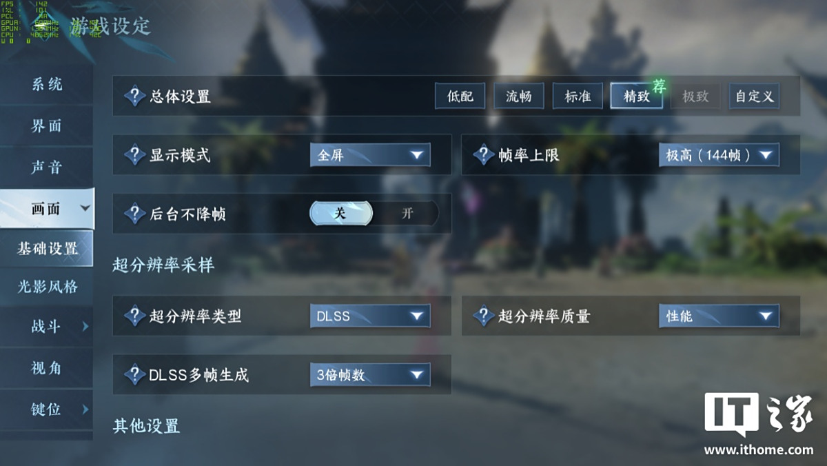 进入游戏后第一步打开设置,看看画面选项相较上一次有何变化。首先,在基础设置中,帧率上限已开放 144 帧(极高)档位和无上限档位。
