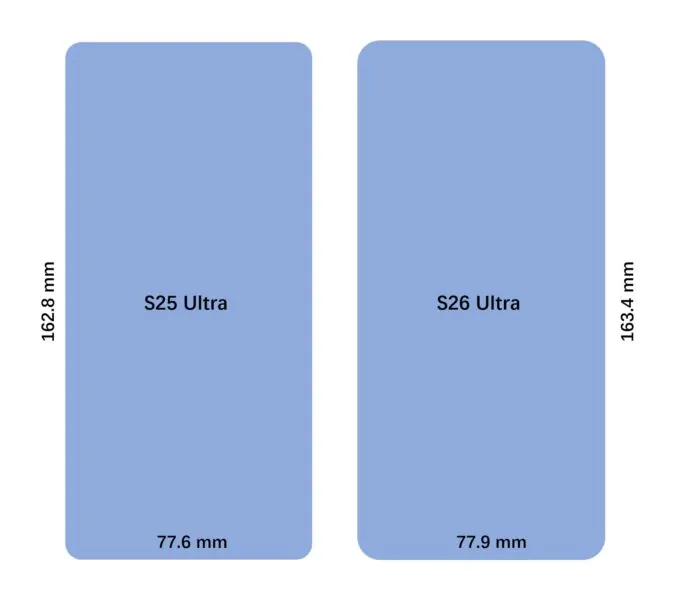 作为对比,三星 Galaxy S25 Ultra 手机的机身尺寸为 162.8×77.6×8.2 mm,这表明 Galaxy S26 Ultra 进一步收窄机身厚度,但略微增加高度和宽度。IT之家附上对比图如下: