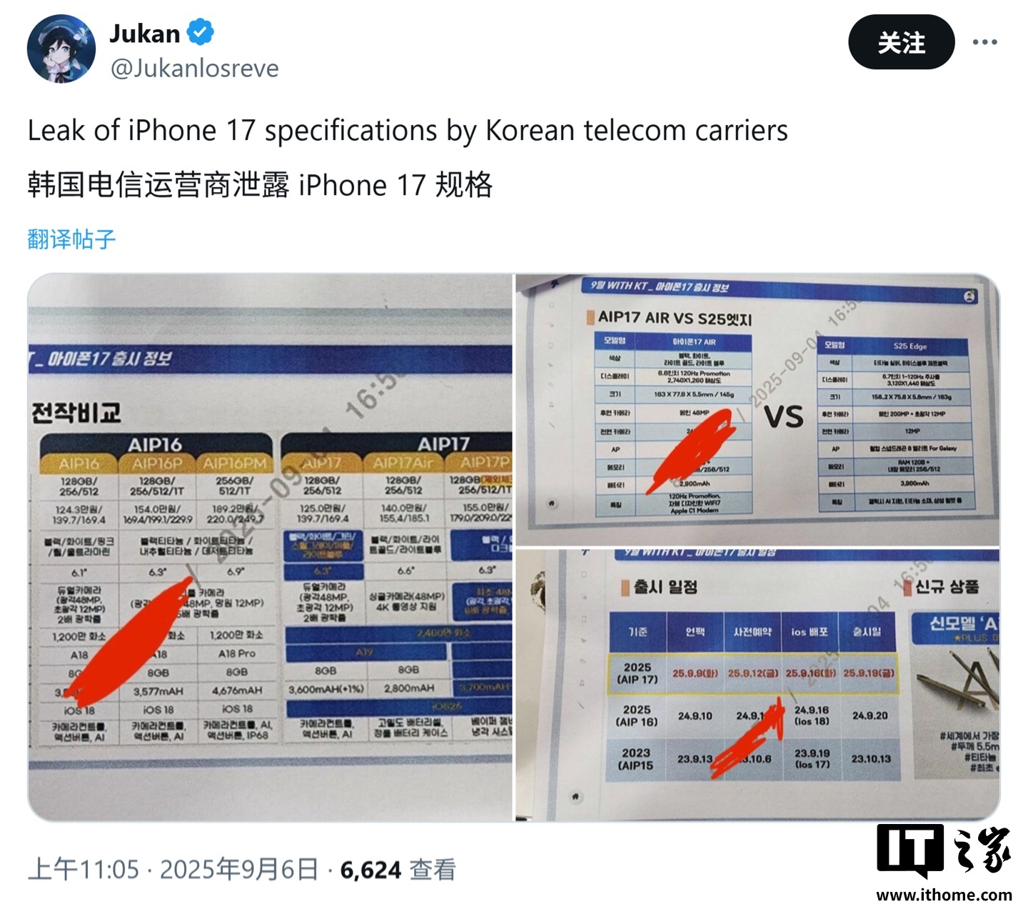IT之家 9 月 6 日消息,科技媒体 WccfTech 今天(9 月 6 日)发布博文,报道称韩国电信运营商泄露苹果 iPhone 17 系列完整规格,包括标准版、超薄 Air 版及两款 Pro 机型,全系搭载 A19 系列芯片,将于北京时间 9 月 10 日凌晨 1 点登场。