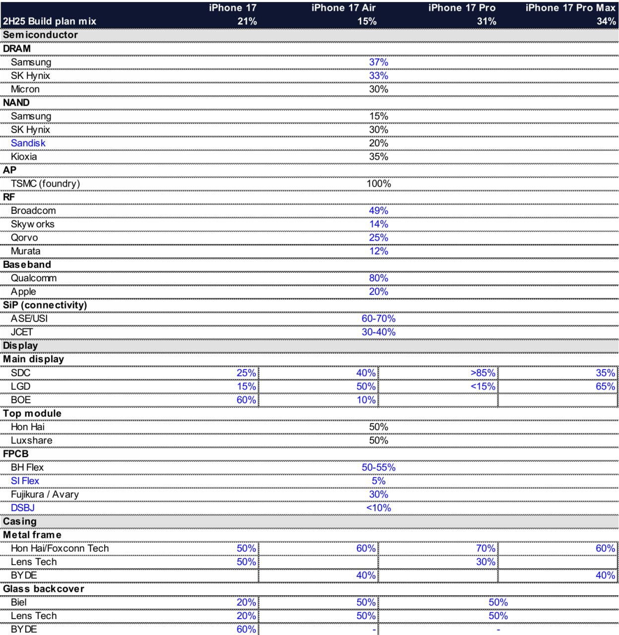 花旗分析报告显示,苹果 iPhone 17 Air 的 DRAM 与 NAND 芯片供应商将拓展至五家厂商:三星电子、SK 海力士、美光科技、闪迪、铠侠。