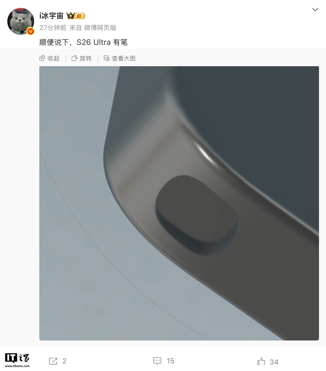 同时,先前网传有消息称三星 S26 Ultra 手机“没有提供手写笔插槽”,结合 S25 Ultra 手写笔功能“大砍”,有不少人认为 S26 Ultra 手机可能直接取消相应设计。不过对此博主 @i冰宇宙 发文展示了 S26 Ultra 手机的最新机模,称该机仍将带有 S Pen 手写笔(插槽)。