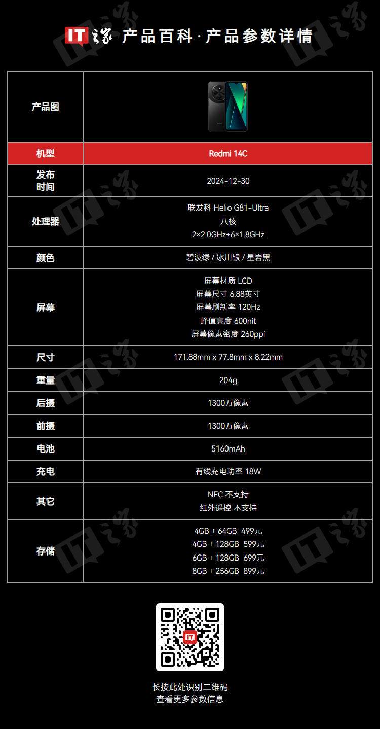 作为对比,小米目前国内市场在售的 REDMI 14C 无充电器版标准价 469 元起,同样采用联发科 Helio G81-Ultra 处理器,配备 120Hz LCD 屏,内置 5160 mAh 电池,支持 18W 有线充电。