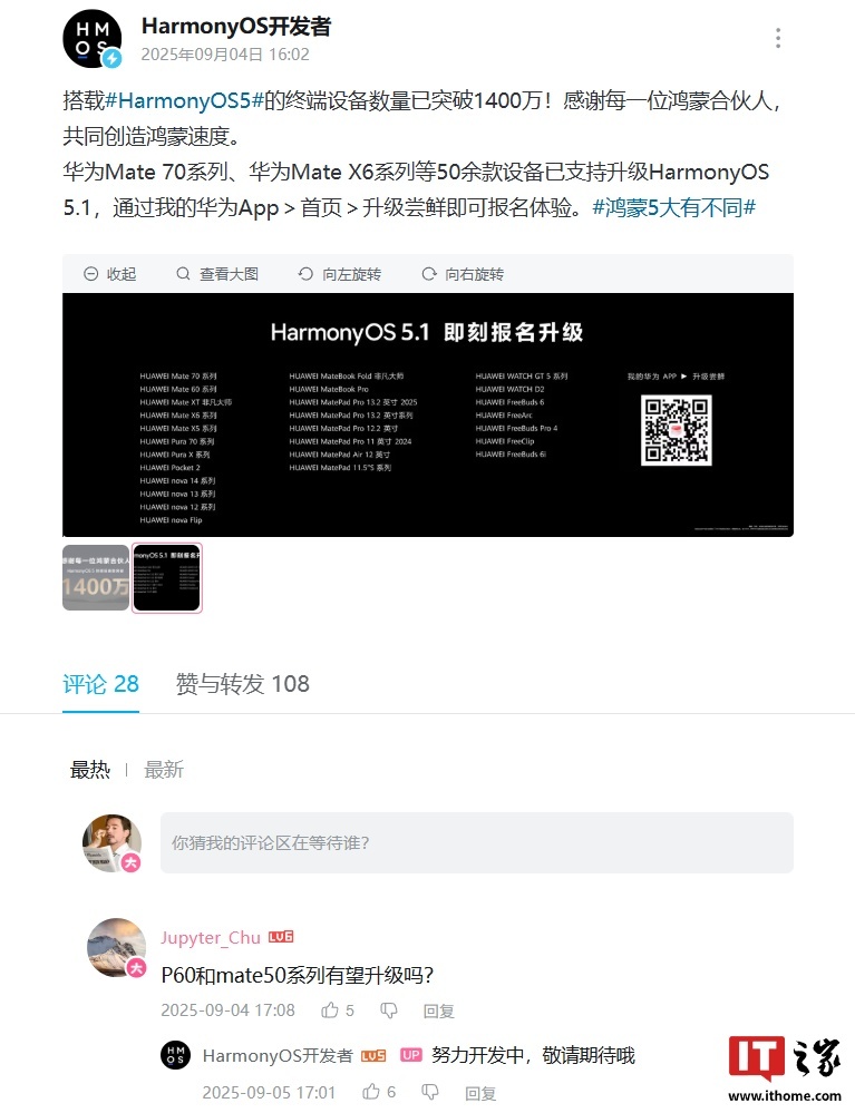 IT之家注意到,有用户向 HarmonyOS 开发者官方账号询问“P60 和 Mate 50 系列有望升级吗?”,对方回应称“努力开发中,敬请期待哦”。这预示着 P60 和 Mate 50 系列机型有望后续升级至 HarmonyOS 5.0 / 5.1 系统。