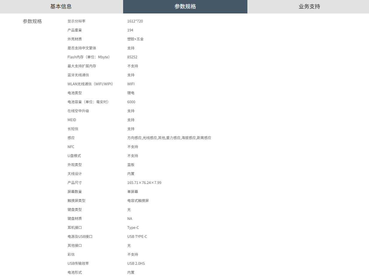 该机搭载 Armv8-A 处理器(具体型号暂未公布)。尺寸为 165.71×76.24×7.99mm、重约 194g,配备 USB Type-C 接口,其屏幕分辨率为 1612*720,内置 6000mAh 电池。