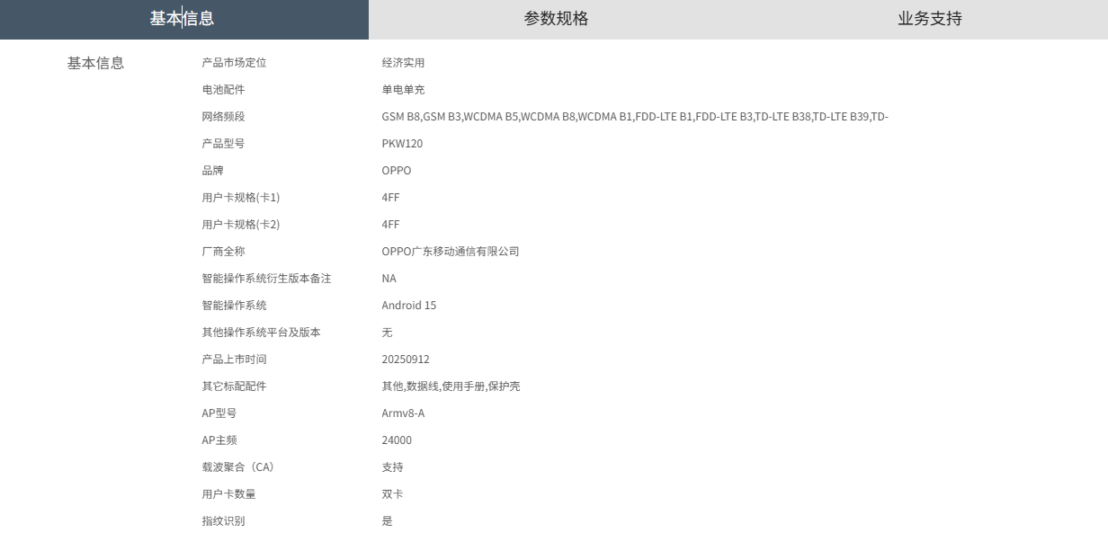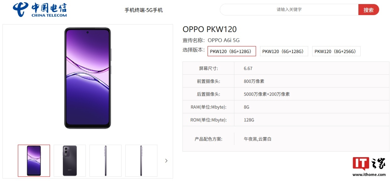 IT之家 9 月 7 日消息,型号为“OPPO PKW120”的 OPPO A6i 5G 手机已现身中国电信终端产品库。该机提供 6GB+128GB、8GB+128GB、 8GB+256GB 三种存储规格,拥有午夜黑、云雾白两种配色,产品零售价格未公布。