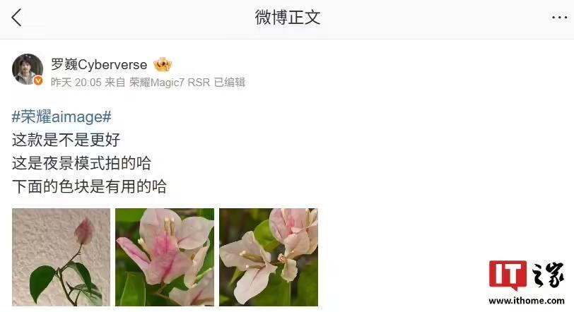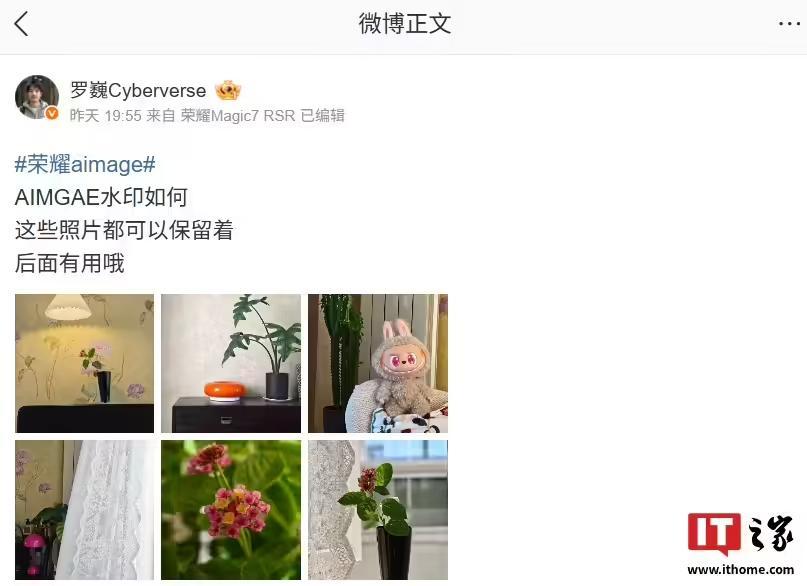 IT之家 9 月 8 日消息,荣耀首席影像工程师罗巍昨日分享了荣耀手机 AiMAGE 影像的全新水印,从拍摄样张可以看到,新水印会拥有 AiMAGE LOGO 和全新色块设计元素。