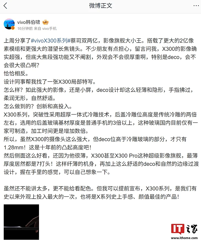 IT之家 9 月 9 日消息,vivo 通信科技有限公司产品经理韩伯啸今日发文预热 vivo X300 系列手机,并公布了一张 X300 的局部特写。