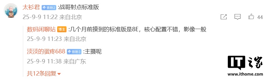 后续有用户在评论区询问:“战哥射点标准版”,博主回复道:“几个月前摸到的标准版是 8E,核心配置不错,影像一般”;另一名用户则询问道:“这颗 2 亿潜望支不支持长焦微距?”,博主则回复道:“母品牌是支持的,子系没必要阉割吧