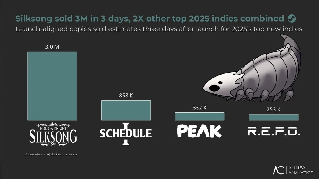 2025 年至今,独立游戏市场表现强劲,但《空洞骑士:丝之歌》的销量遥遥领先。Alinea Analytics 报告称,上线三天后,Steam 平台上销量最高的四款游戏如下:
