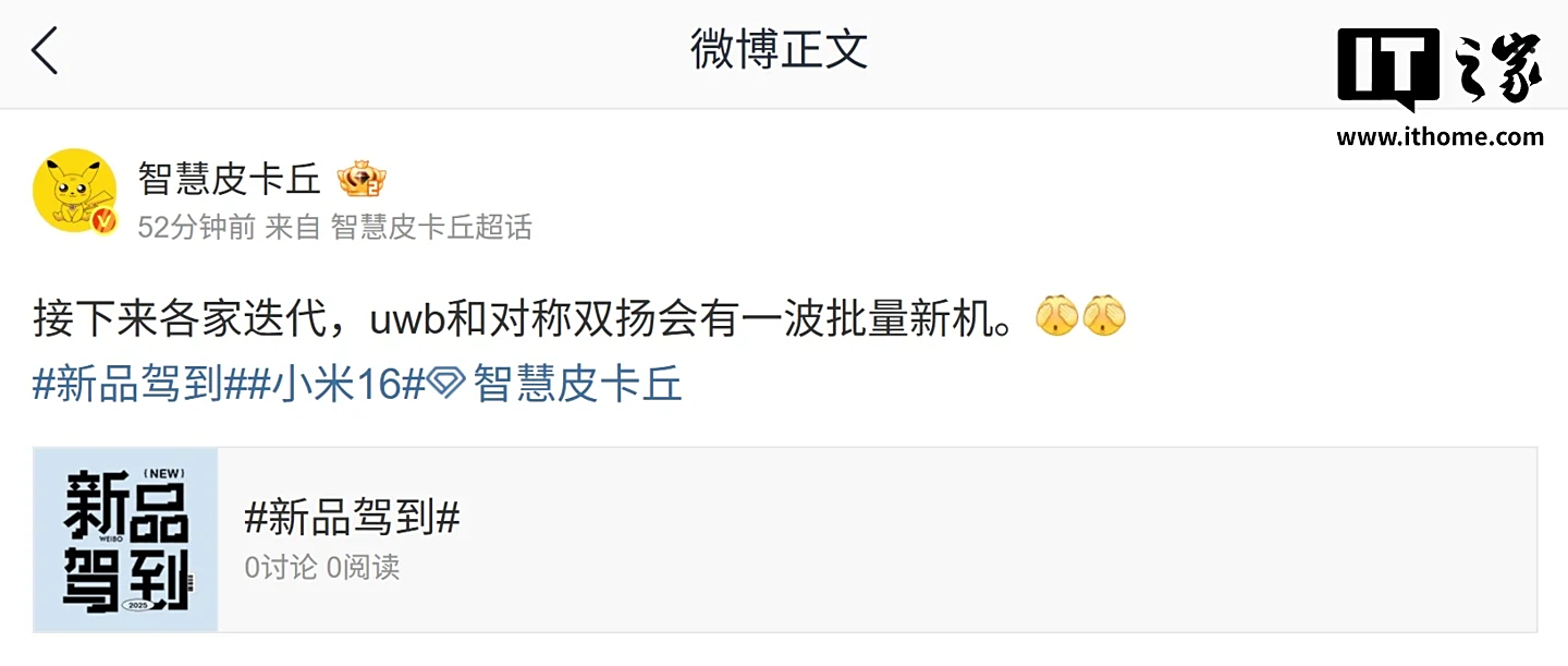 文章来源于互联网:IT之家-消息称各家手机厂商迭代新机将配 UWB、对称双扬声器,小米 16 系列预计在列
